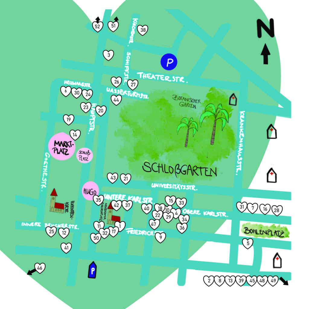 Am besten schlenderst Du (oder Du leihst Dir ein Rad) vom Theaterplatz durch die malerische Altstadt, schaust Dir die schönen Läden in der Wasserturmstraße an, weiter über den Marktplatz, mit seinen bunten Ständen – voll von duftenden Blumen, reifen Früchten und regionalen Produkten – zum Hugo (Hugenottenplatz). Von hier aus schlägst Du Dich in Richtung Osten links zur Unteren Karlstraße (unsere Genußmeile) durch. Weiter geht es zur Oberen Karlstraße und zum Bohlenplatz. Biege dann über die Friedrichstraße zum Neustädter Kirchenplatz ab. Überall auf dem Weg wirst Du hübsche, kleine, inhabergeführte Läden, tolle Cafés und nette Lokale entdecken. Auch als Erlanger*in kannst Du in Deiner Stadt immer wieder Neues ausfindig machen.